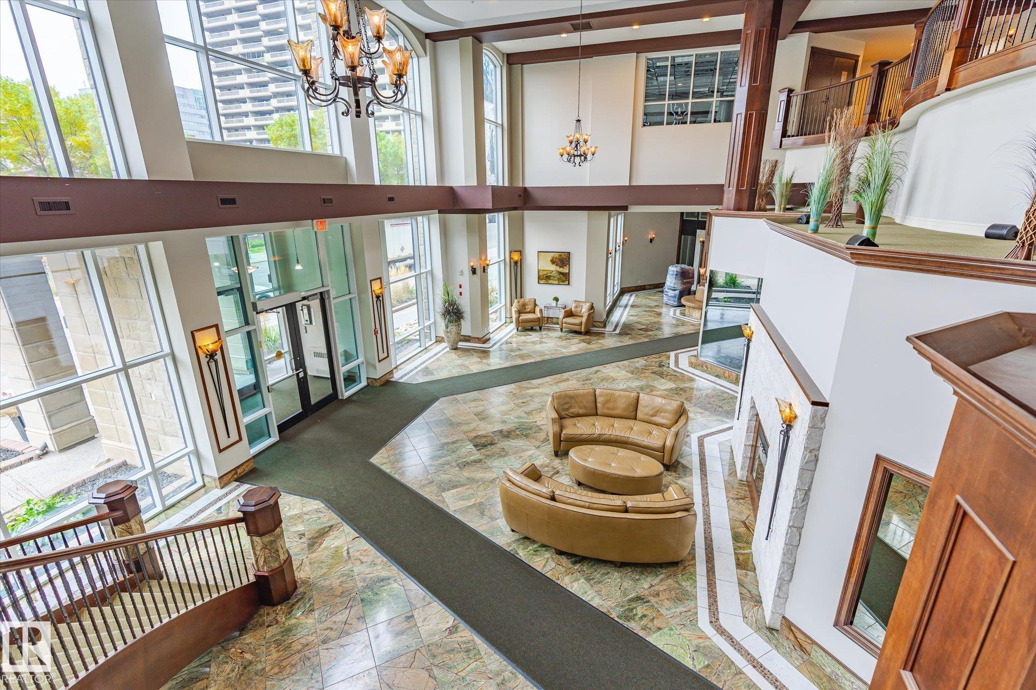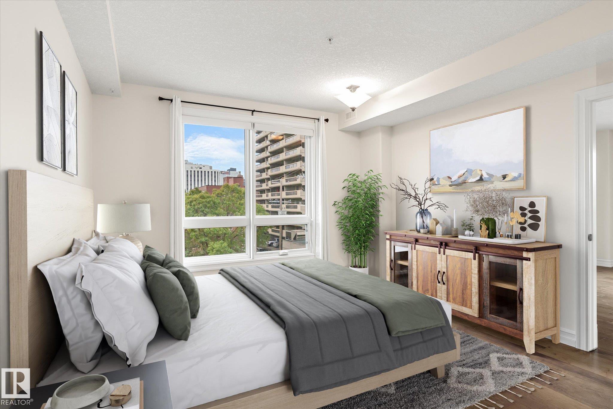 Experience refined urban living in this 3rd floor CORNER UNIT at the spectacular MERIDIAN PLAZA. Designed for entertaining, the open-concept layout showcases hardwood floors, 9' ceilings, a cozy gas fireplace, and an elegant living and dining area bathed in NATURAL LIGHT from south-facing windows & patio doors to the balcony. The well-appointed kitchen features granite countertops, stainless steel appliances, and a stylish breakfast bar. The primary suite offers a spa-inspired 5pc ensuite with dual vanities, soaker tub, glass shower, and a spacious walk-in closet. A second generous bedroom and full bath are privately situated on the opposite side of the suite. Additional highlights include in-suite laundry with storage, TITLED UNDERGOUND PARKING, and access to PREMIUM AMENITIES: a Mediterranean-style atrium, fitness centre, owners' lounge, event space with a full kitchen, & bike storage. Just one block to Jasper Ave and steps from restaurants, trails, shopping conveniences, & the Ice District. MLS®: E4472244 - Wîhkwêntôwin Single Level Apartment $325,000